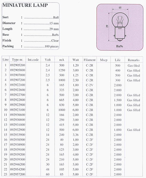 | [828] | Kugellampen, Sockel: BA9s, Maße: 15 x 29 mm Falls die von ihnen gesuchte Lampe hier nicht aufgelistet ist, schicken sie bitte eine Anfrage mit der Typ-Nummer die im Datenblatt angegeben ist. |